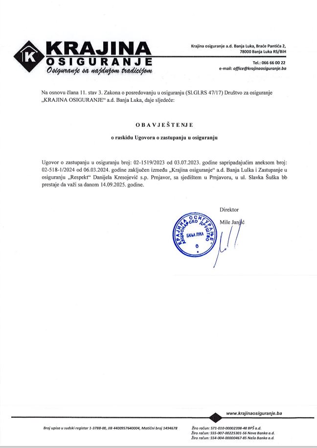 • Zastupanje u osiguranju „RESPEKT“ Danijela Kresojević, s.p. Prnjavor Slavka Šuška bb, Prnjavor
